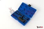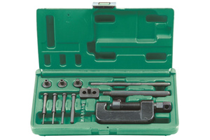 · Przyrząd do zakuwania i rozkuwania łańcucha: Narzędzie to umożliwia precyzyjne rozdzielanie i łączenie ogniw łańcucha. Proces ten polega na wybijaniu sworzni łączących ogniwa (rozkuwanie) oraz ich ponownym osadzaniu (zakuwanie) w celu utworzenia solidnego połączenia. Narzędzie jest wyposażone w mechanizm umożliwiający dokładne prowadzenie sworznia oraz jego mocne osadzenie w ogniwie.