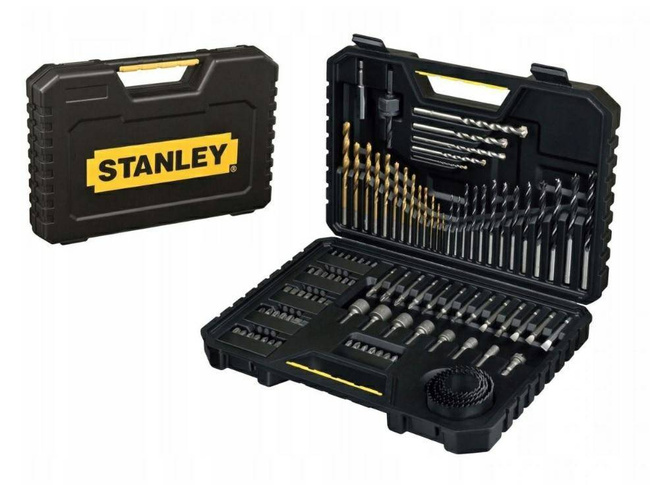 - 100-częściowy zestaw Stanley STA7205 w walizce: wiertła do drewna, metalu i muru, końcówki wiertarskie 25 mm i 50 mm, uchwyt magnetyczny, końcówka do fazowania otworów, końcówki nasadkowe, otwornice do drewna z uchwytem.