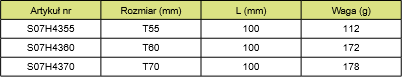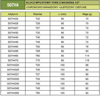 Parametry techniczne poszczególnych kluczy wpustowych TORX z nasadką 1/2" Jonnesway: