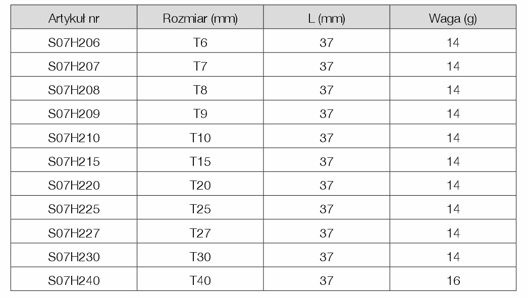 Parametry poszczególnych rozmiarów kluczy wpustowych 1/4" bit TORX z nasadek: