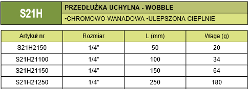 - przedłużka uchylna z serii S21H spełnia wymogi norm międzynarodowych w kwestii twardości i maksymalnego momentu obrotowego;