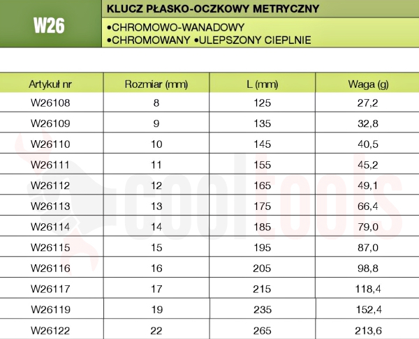 - klucze płasko-oczkowe wykonane ze stali chromowo-wanadowej (Cr-v);