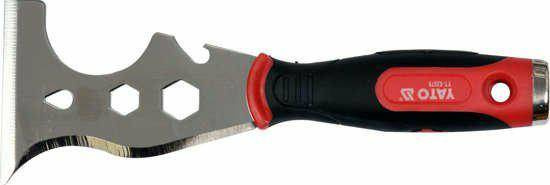 Skrobak z profilowanymi krawędziami do czyszczenia łuków, z otwieraczem do kapsli i ostrzem z przodu. Na środku otwory do wyciągania gwoździ i dwa profile dokręcania śrub.