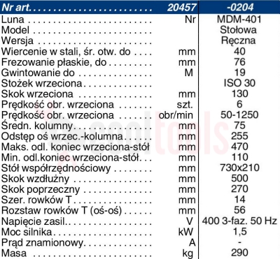 Parametry techniczne wiertarko - frezarki marki Luna MDM 401: