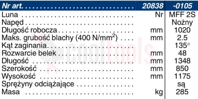 Parametry techniczne giętarki krawędziowej marki Luna MFF 2S: