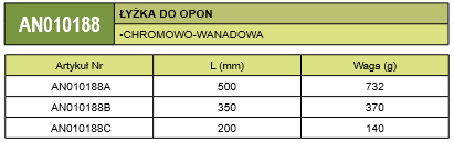 Parametry techniczne poszczególnych rozmiarów łyżek do opon Jonnesway:
