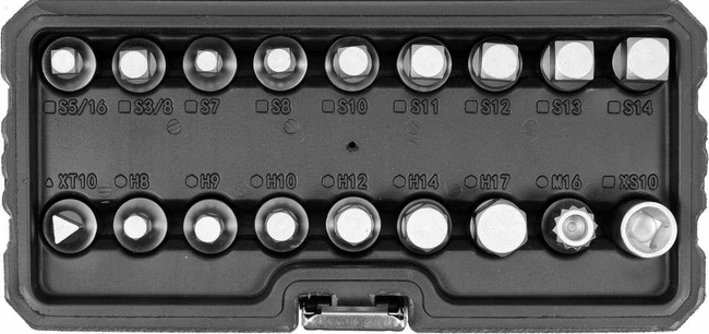 - Zestaw 18 nasadek przeznaczonych do odkręcania i zakręcania korków spustowych oleju w misce olejowej.