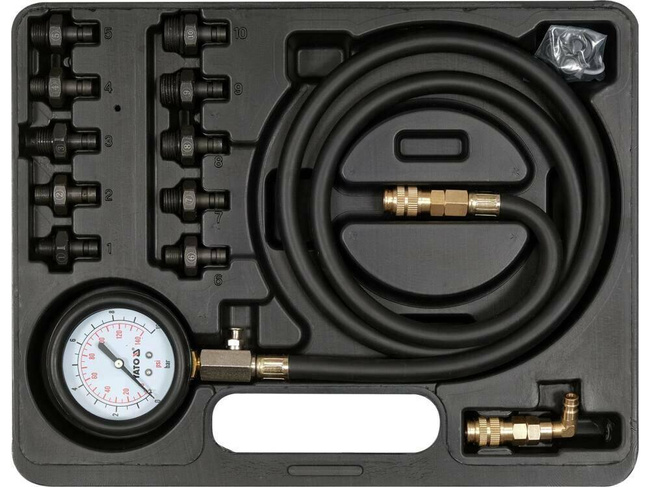 Profesjonalny miernik ciśnienia oleju. Zestaw zawiera 10 redukcji, dzięki którym miernik obsługuje większość silników. Obudowa manometru jest chroniona dodatkowo gumową osłoną.